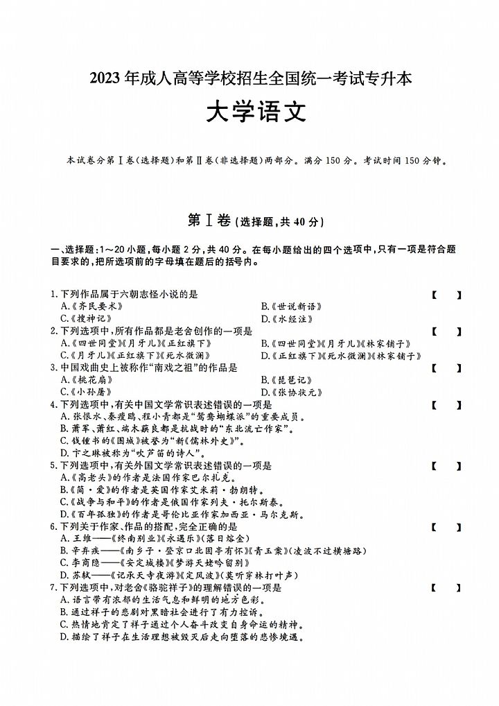 2023年成人高考专升本《高等数学(一)》真题及答案